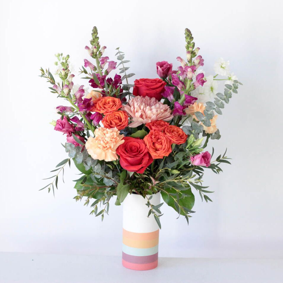This arrangement featured bright orange roses, burgundy snapdragons, and peachy tones, arranged in a multicolor ceramic vase.
