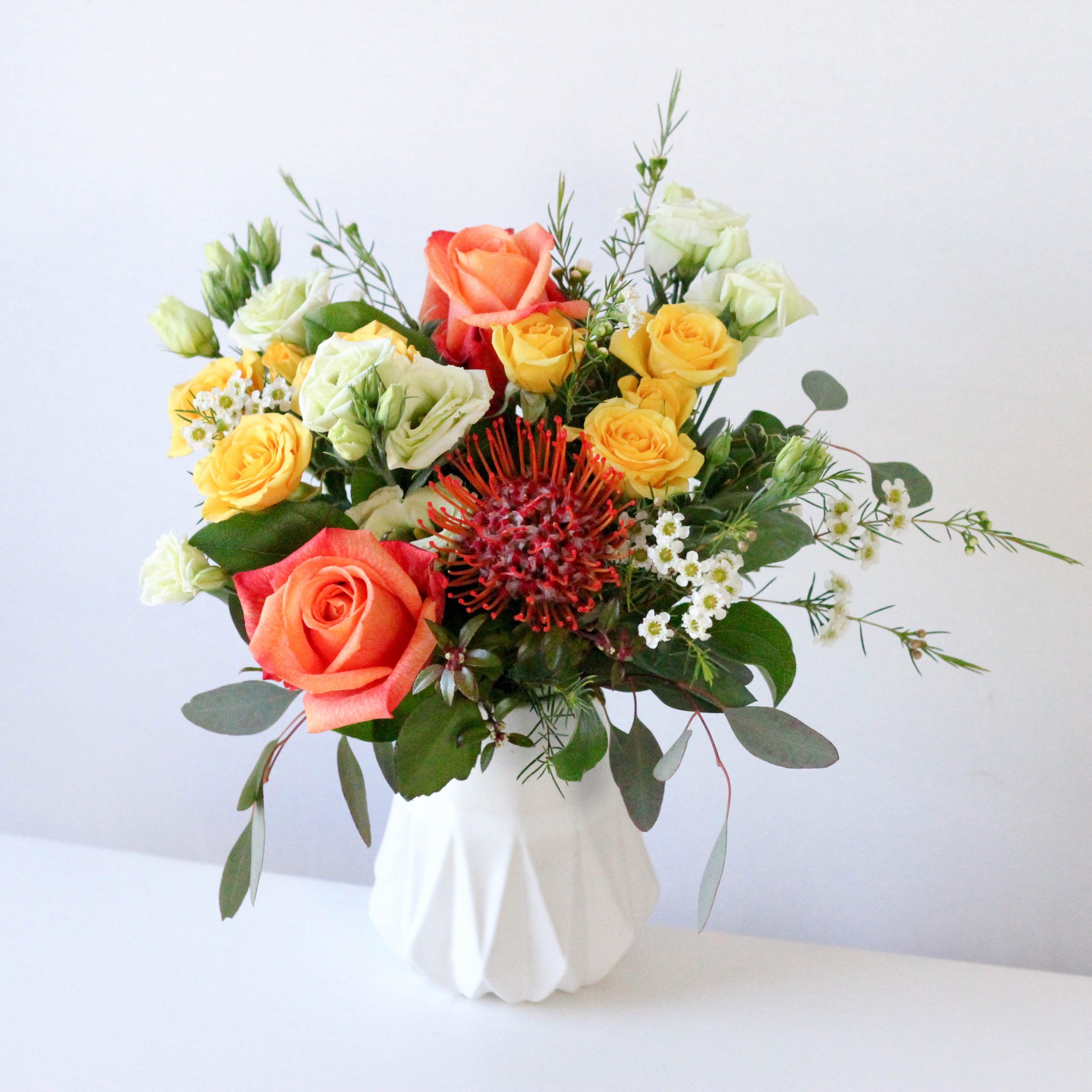 Delivered in a sculpted white ceramic vase; Arrangement measures approx. 10″ W x 14′ H