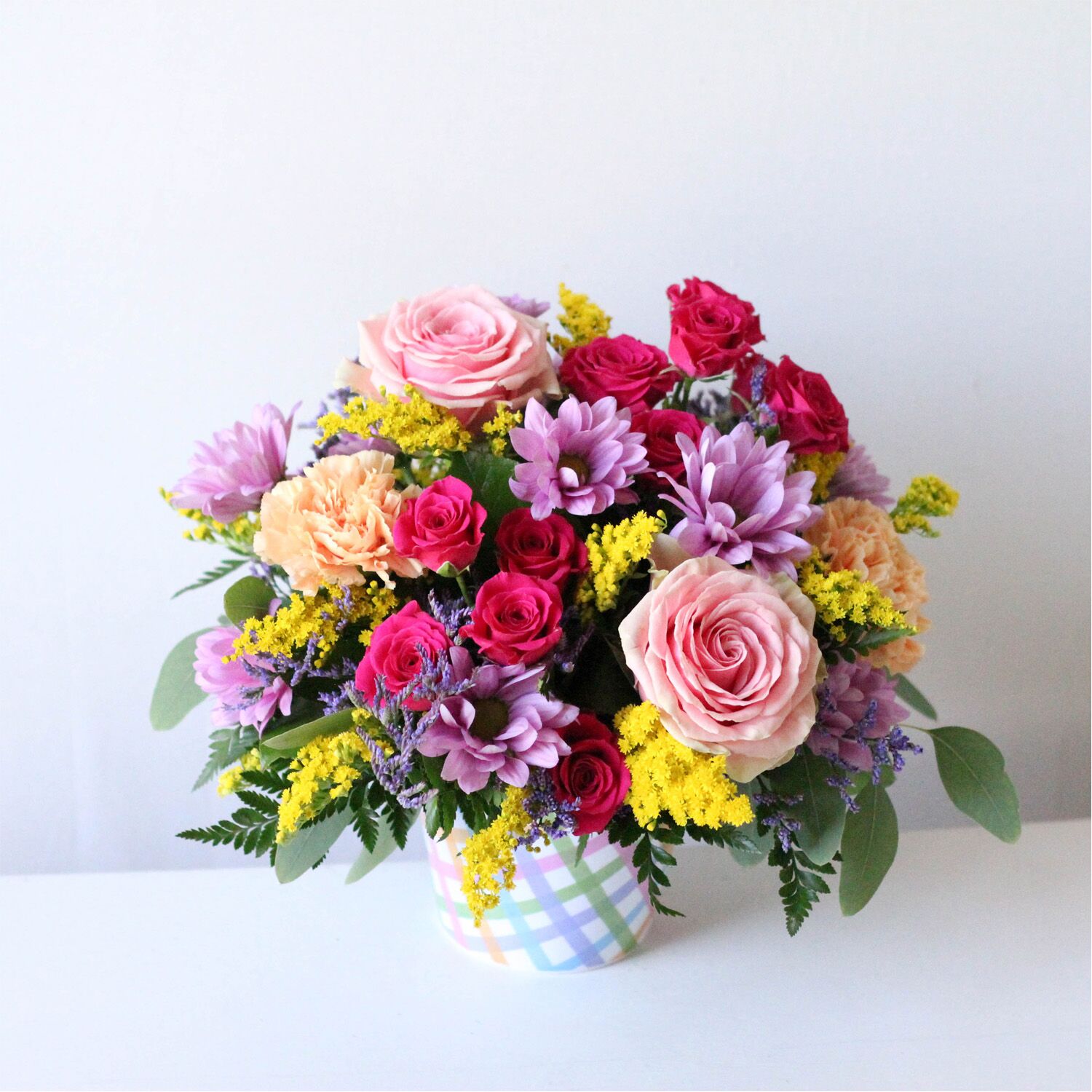 A sweet bouquet full of southern charm of fresh cut blooms in a keep-sake pastel gingham pattern