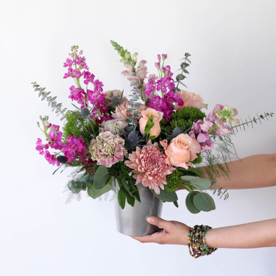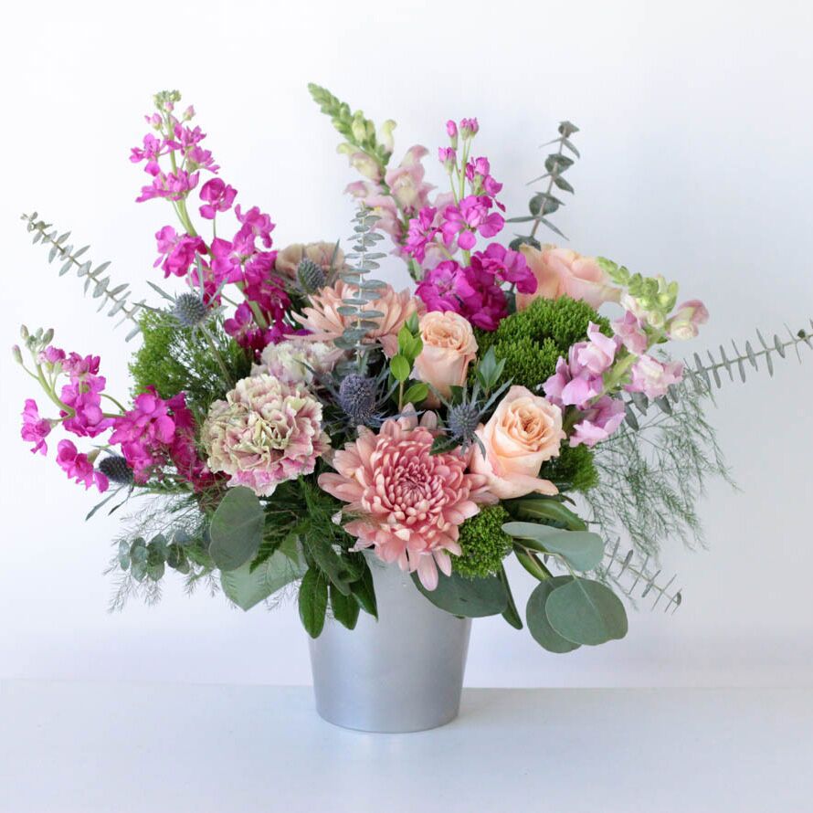 Show them how much you love them with this gorgeous arrangement featuring fuchsia, berry, and peach tones including roses, snapdragons, mums, with accents of eucalyptus in a silver ceramic container.