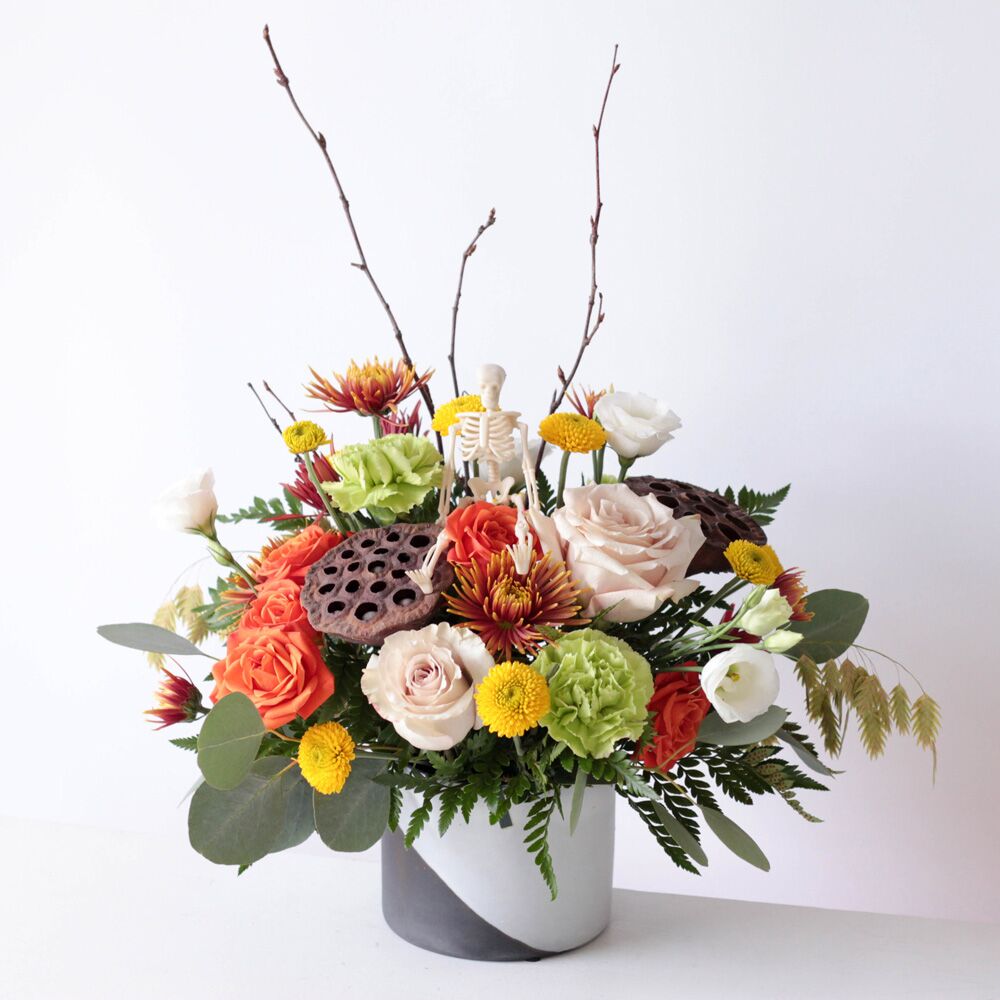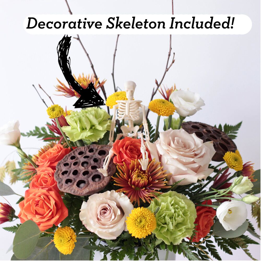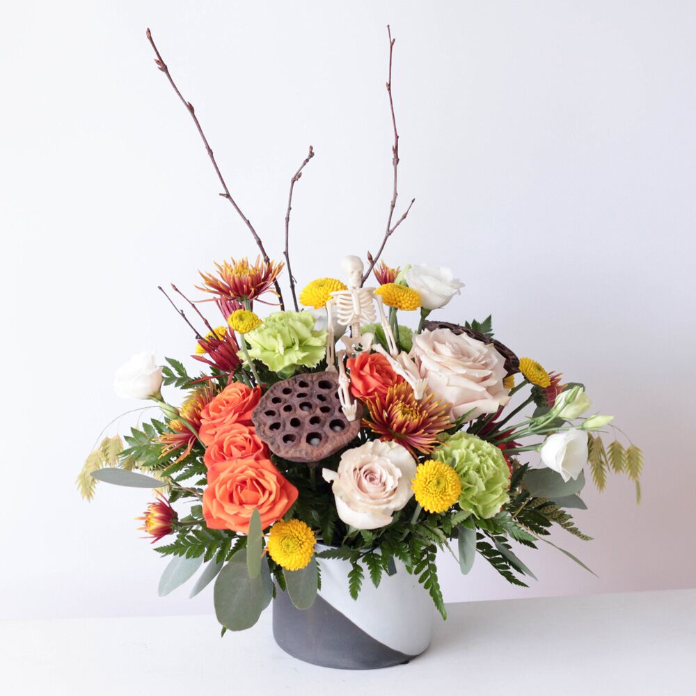Romantic orange roses radiate from their counterparts’ greens, yellows, and creams, while leather leaf fern, dried lotus pods, and curly willow branches create textured edges. Keep an eye out for a hitchhiking, plastic skeleton!