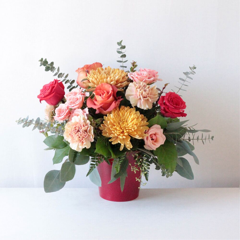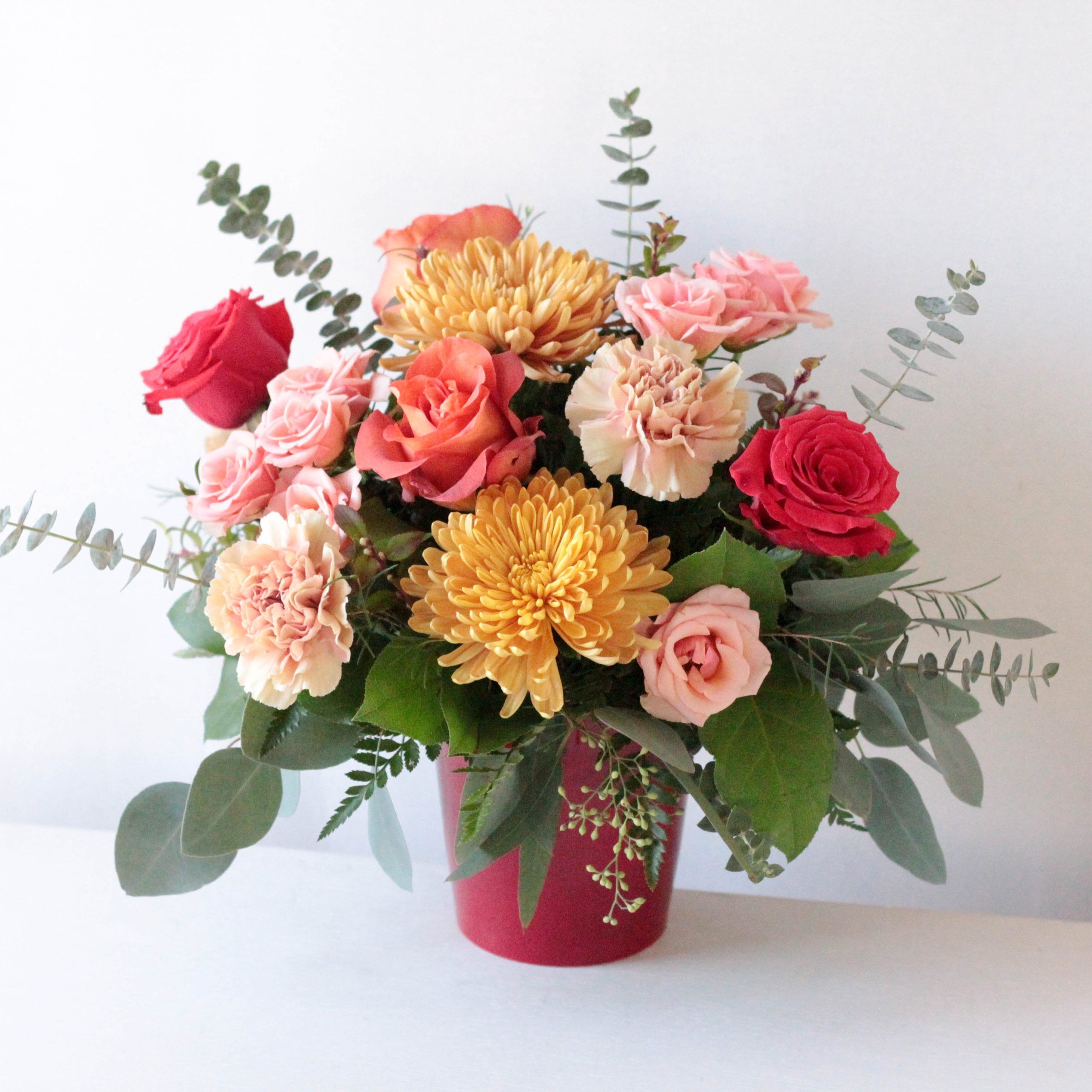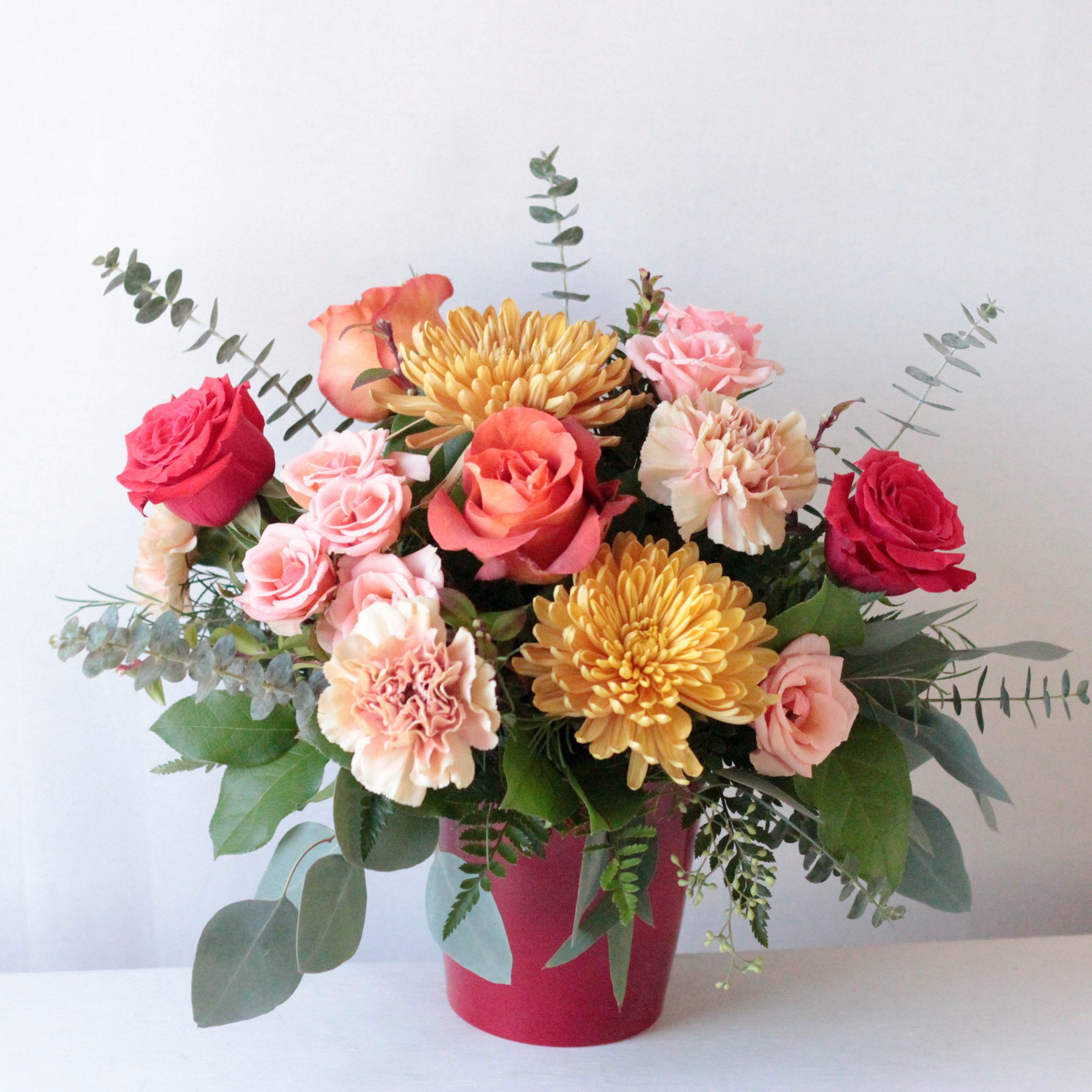 Delivered in a red ceramic vase; Arrangement measures approx. 14″ W x 13″ H