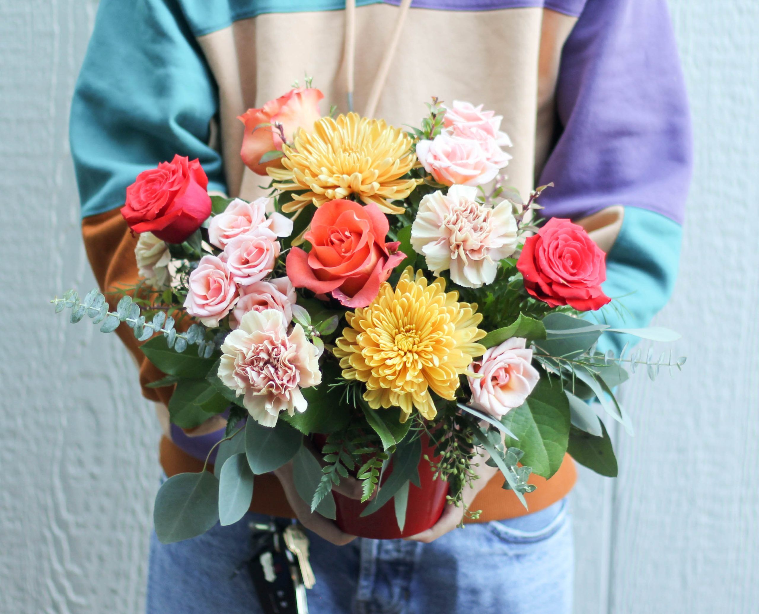Roses, spray roses, carnations, and mums adorned by seasonal greens and fillers.