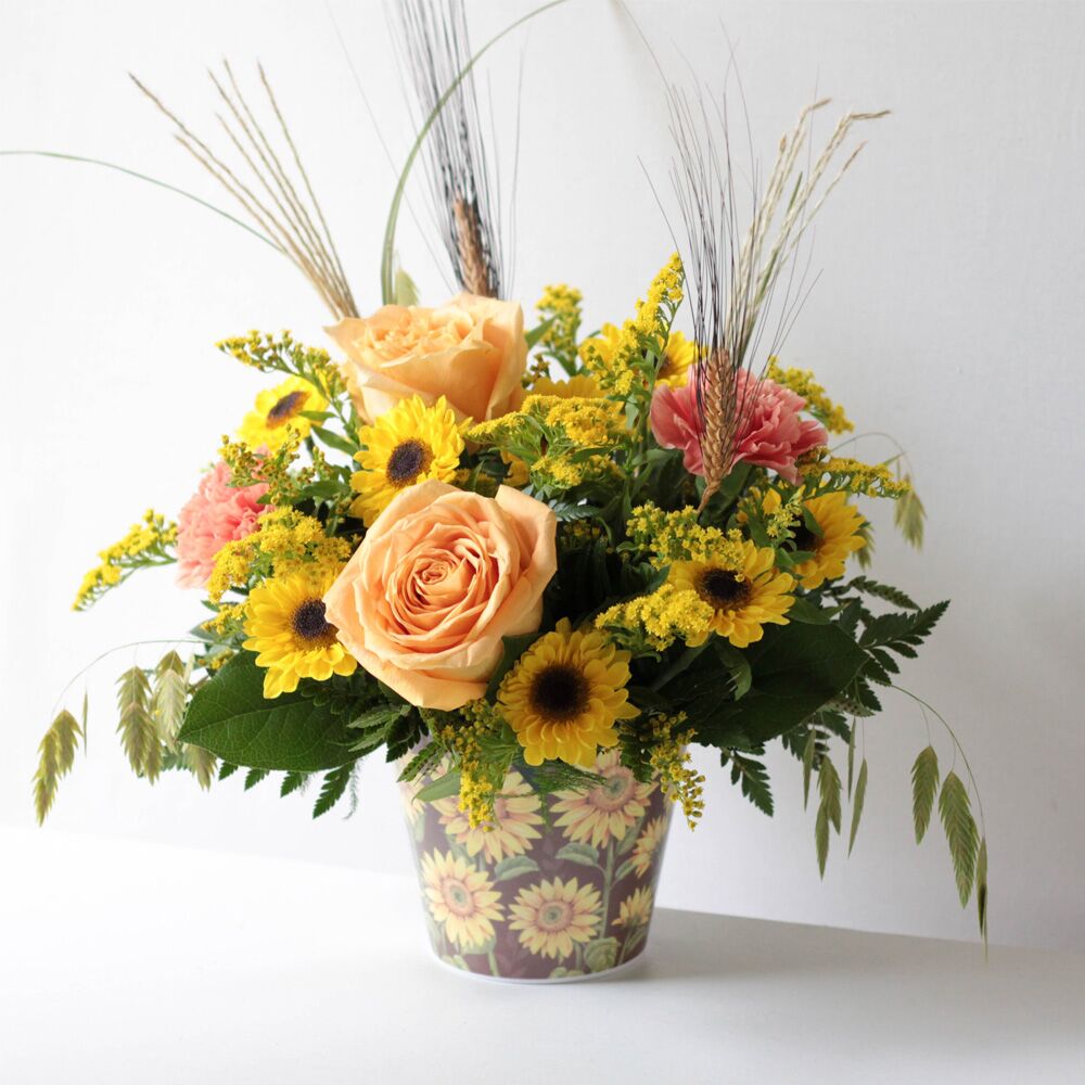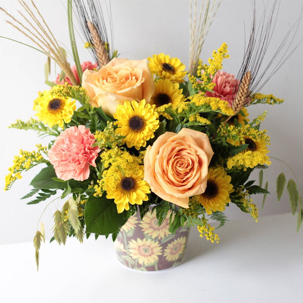 Sunflowers, roses, Viking poms, carnations, and solidago are nestled in a bed of seasonal with dried wheat accents.