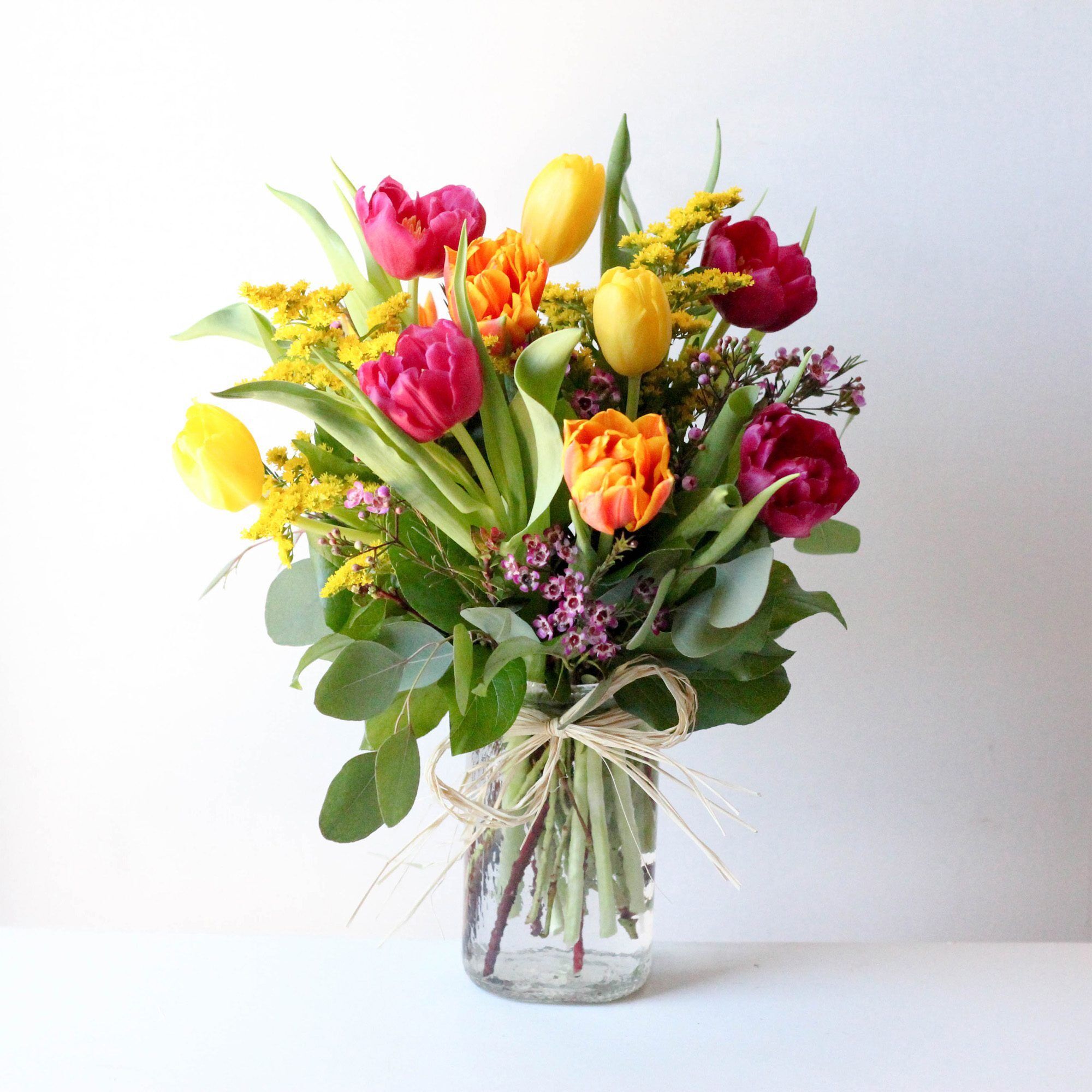 Delivered in hammered glass jar; Arrangement stands approx. 12″ W x 14″ H