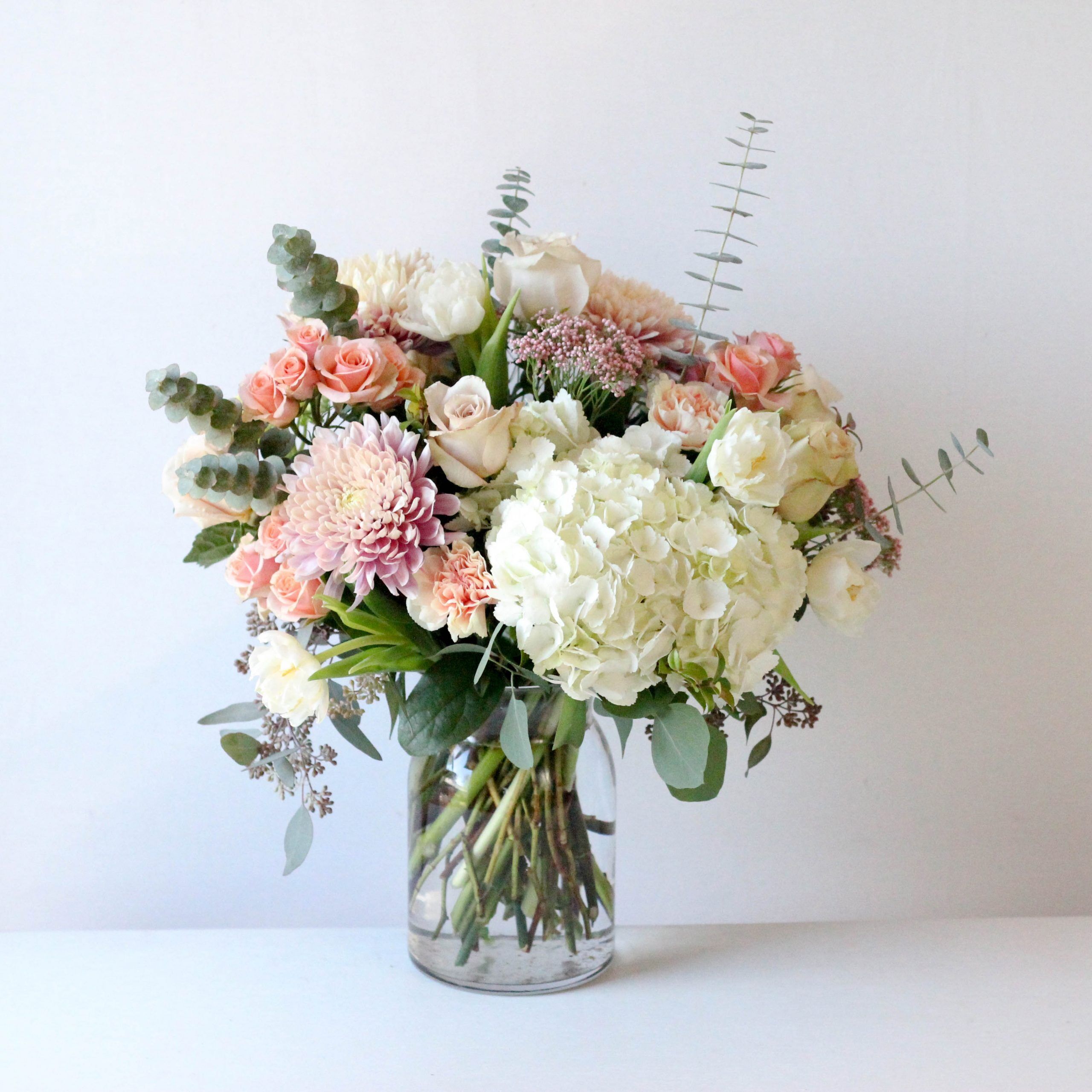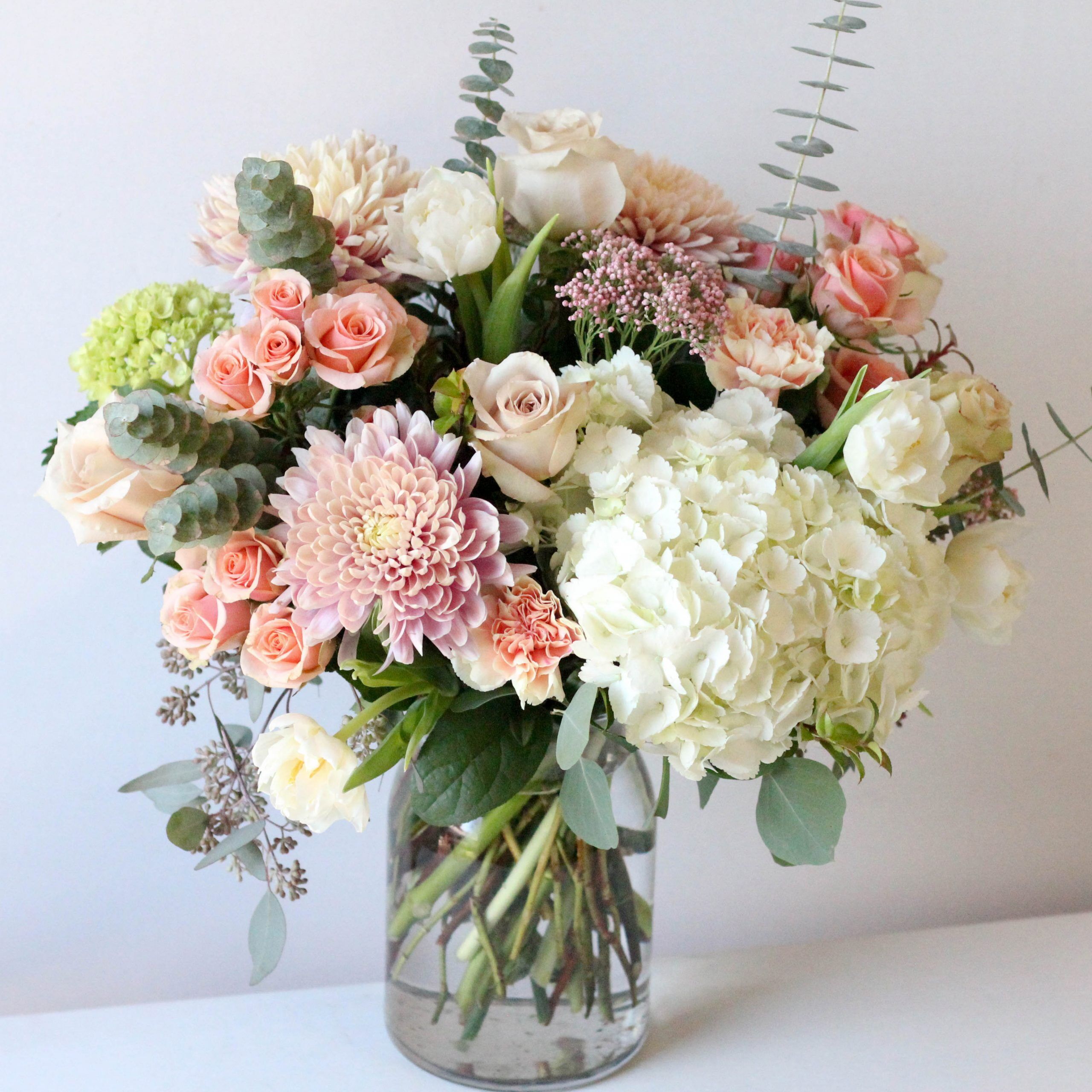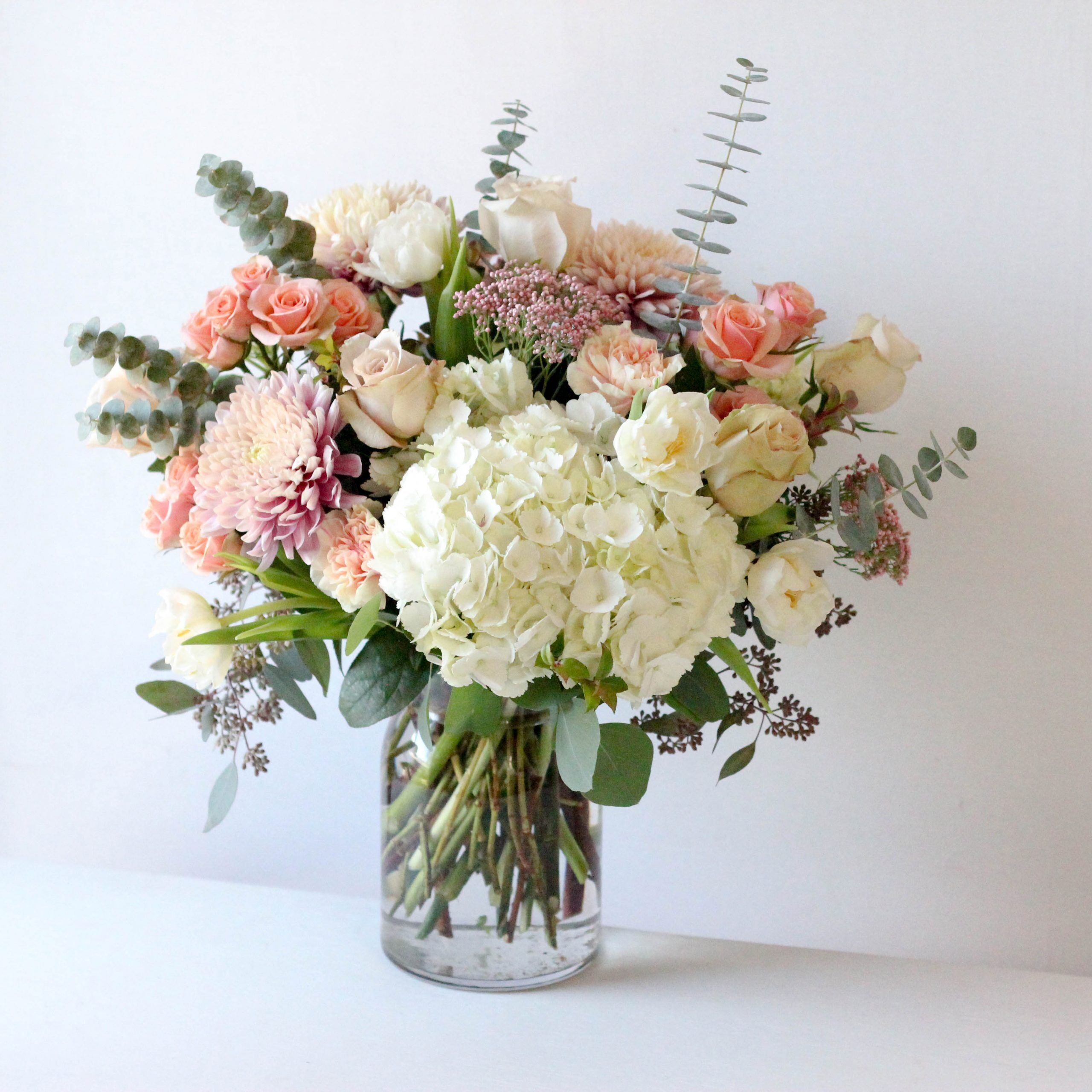 Elegant and classy this arrangement showcases billowy white hydrangea, mini green hydrangea, soft roses, spray roses and tulips accented by assorted eucalyptus greens.
