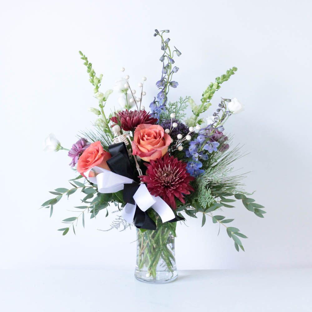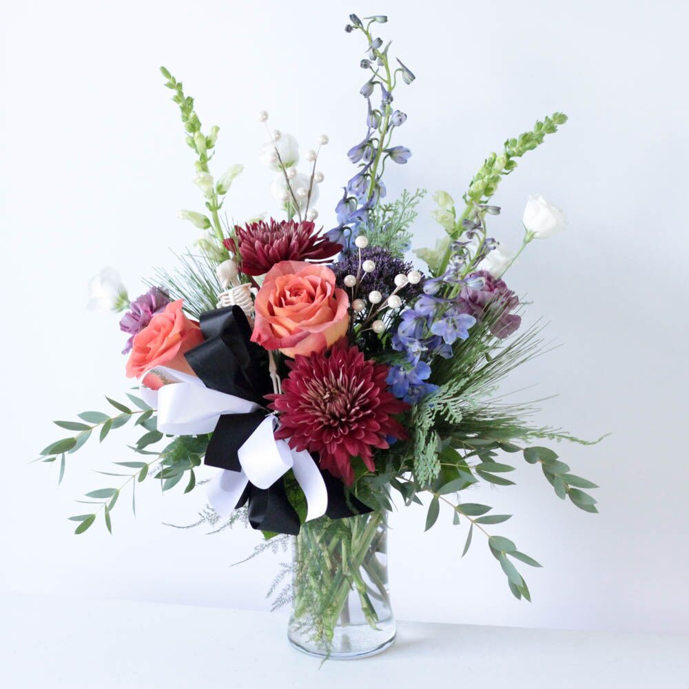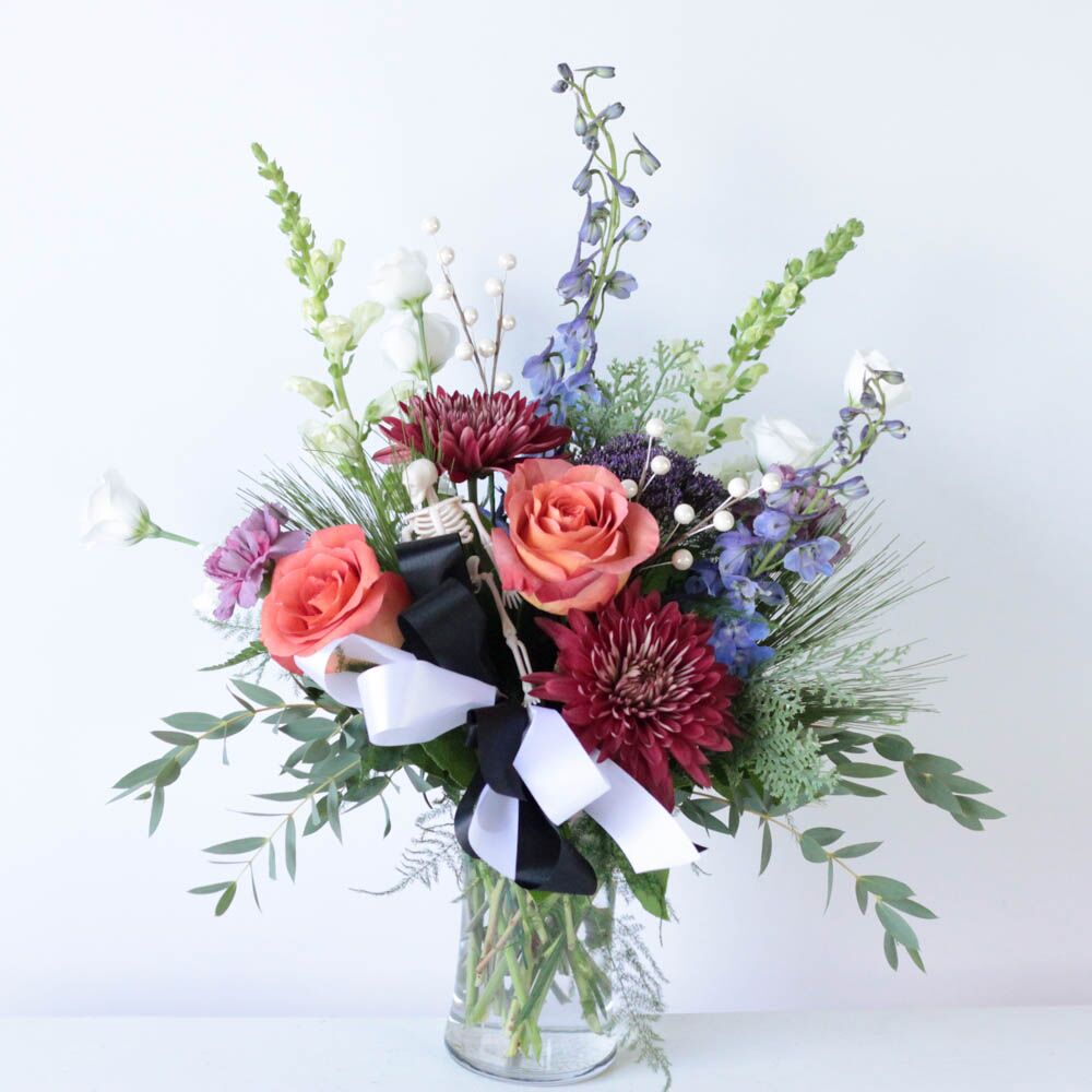 Arrangement features a skeleton, burgundy cremon, and blue delphinium accented with a black and white bow.