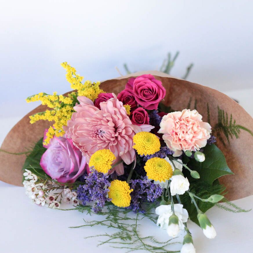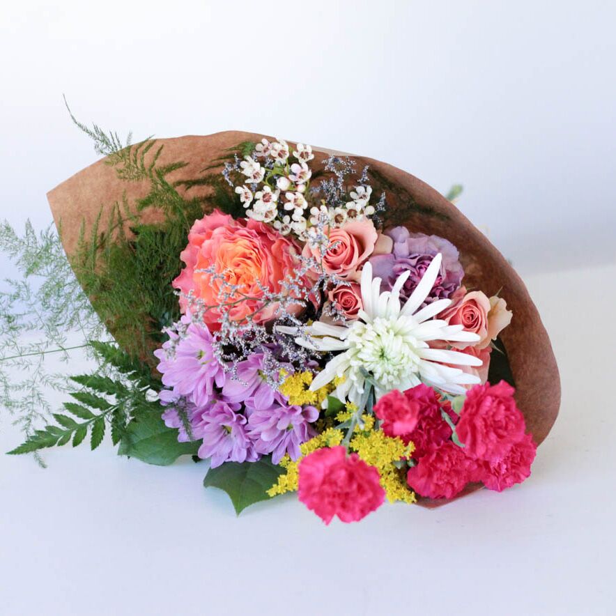 Flowers are wrapped in paper accented by a raffia bow and flower food is included.