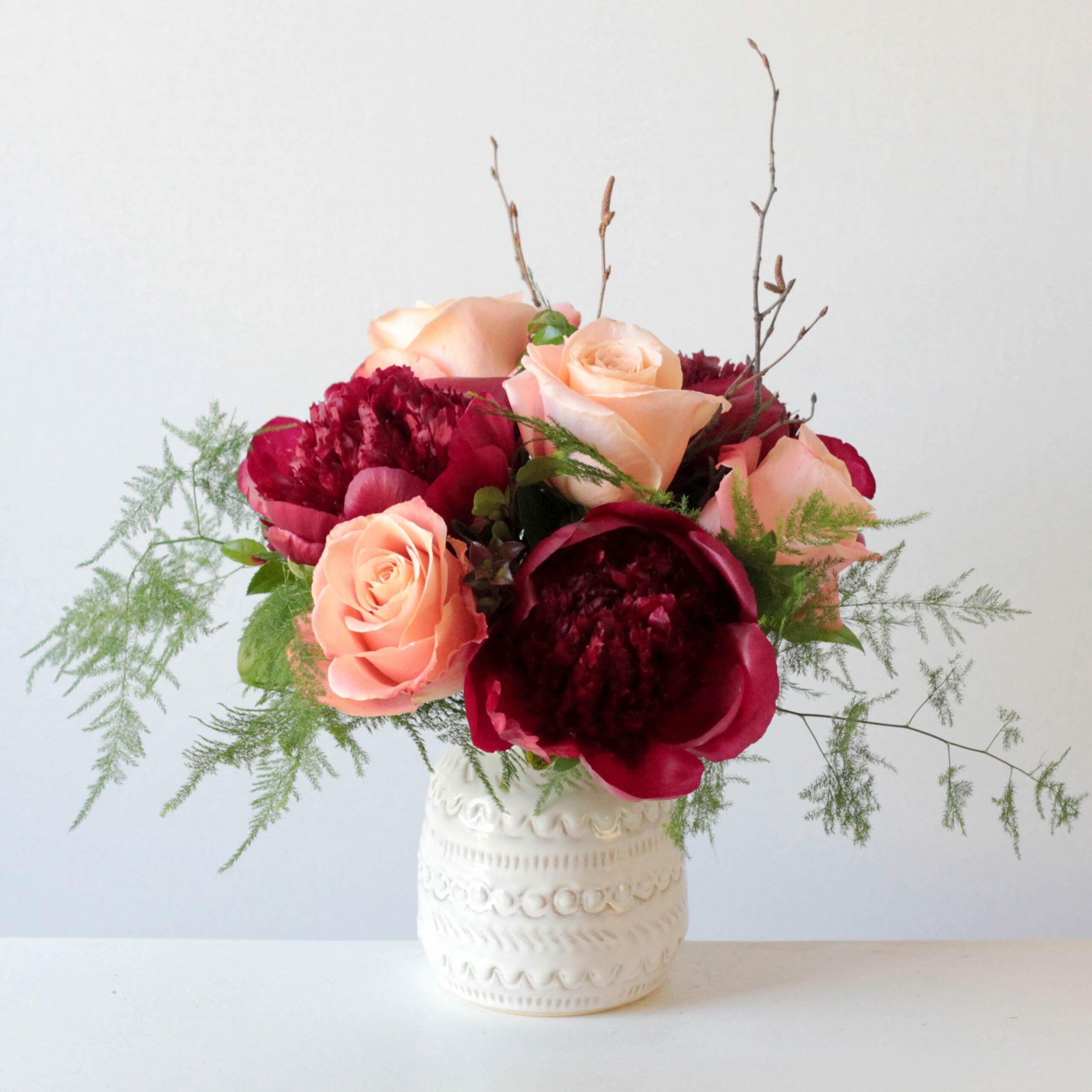 Three gorgeous peonies dance among four summery roses in a glass vase.