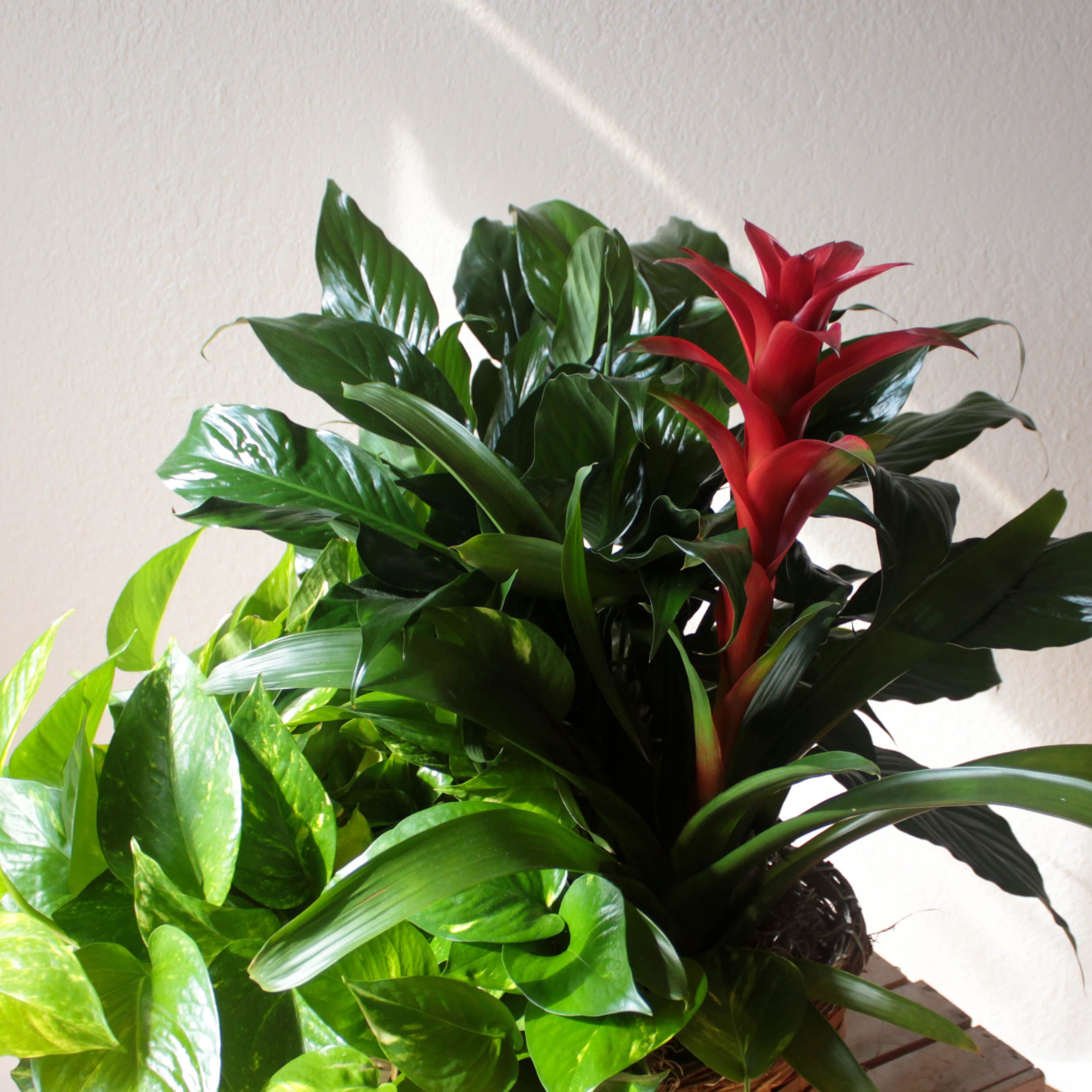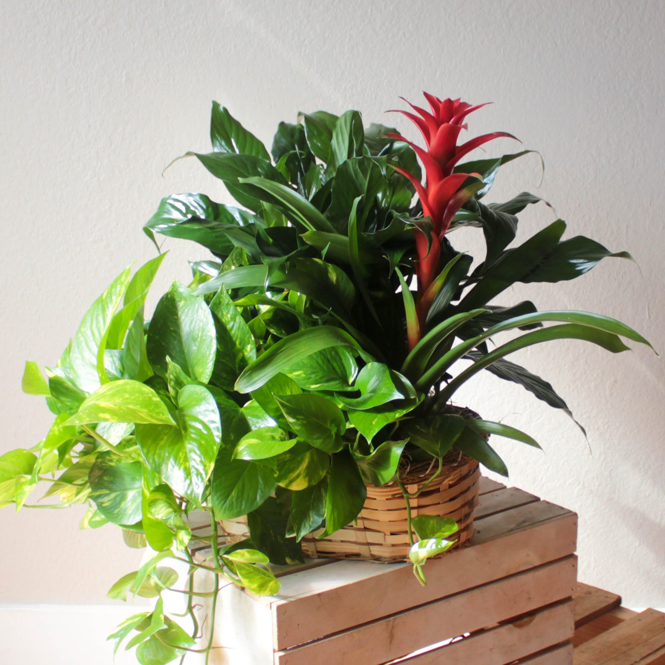 Three 6″ plants, potted separately but sharing a wicker basket. Plant variety may vary.