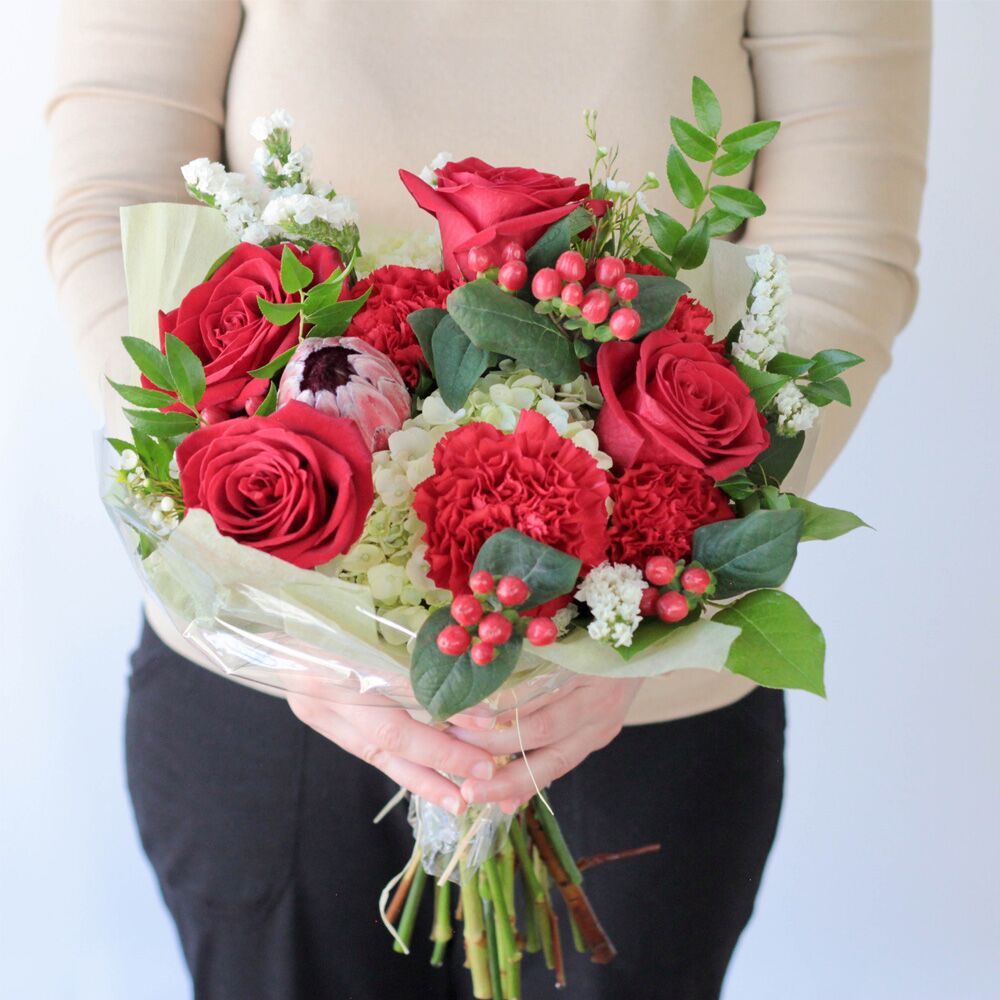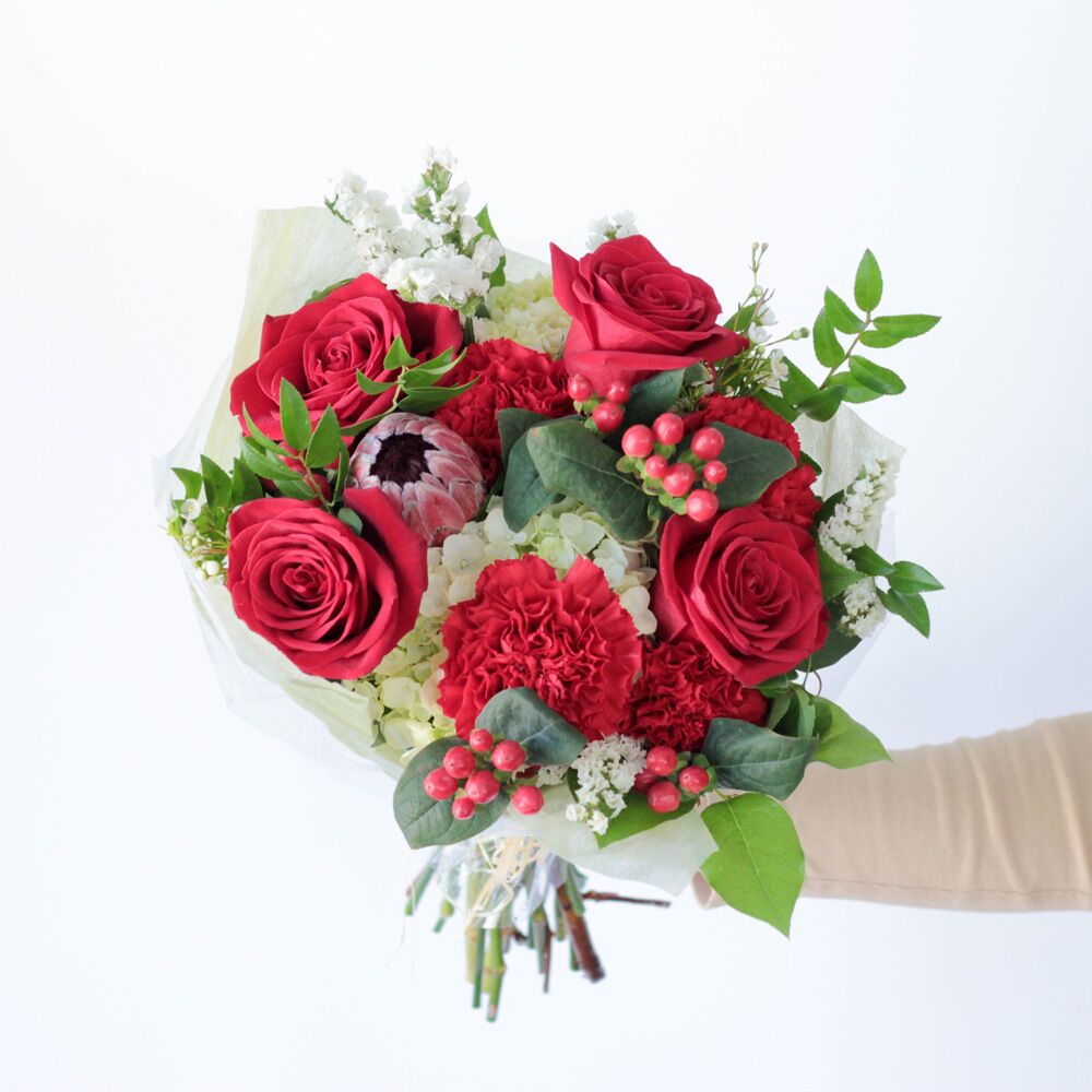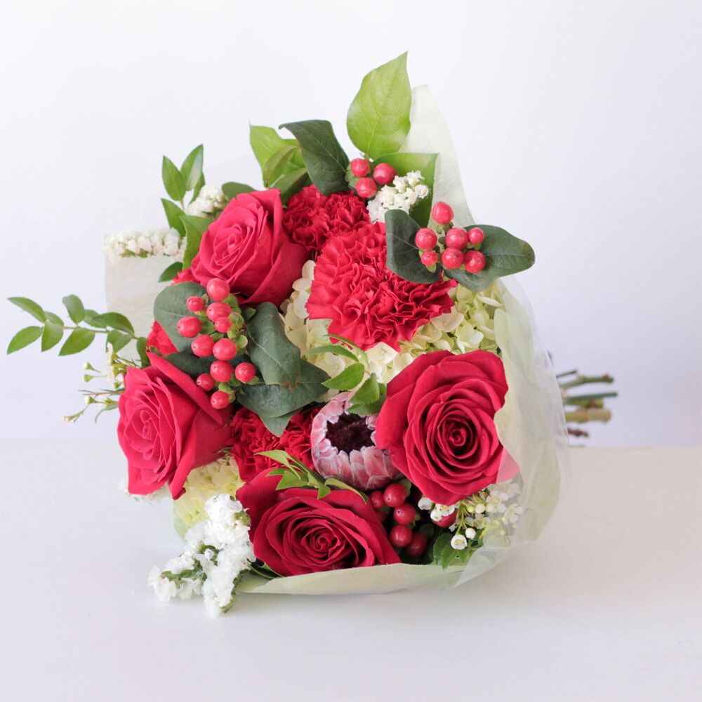 Flowers are wrapped in paper accented by a raffia bow and flower food is included.