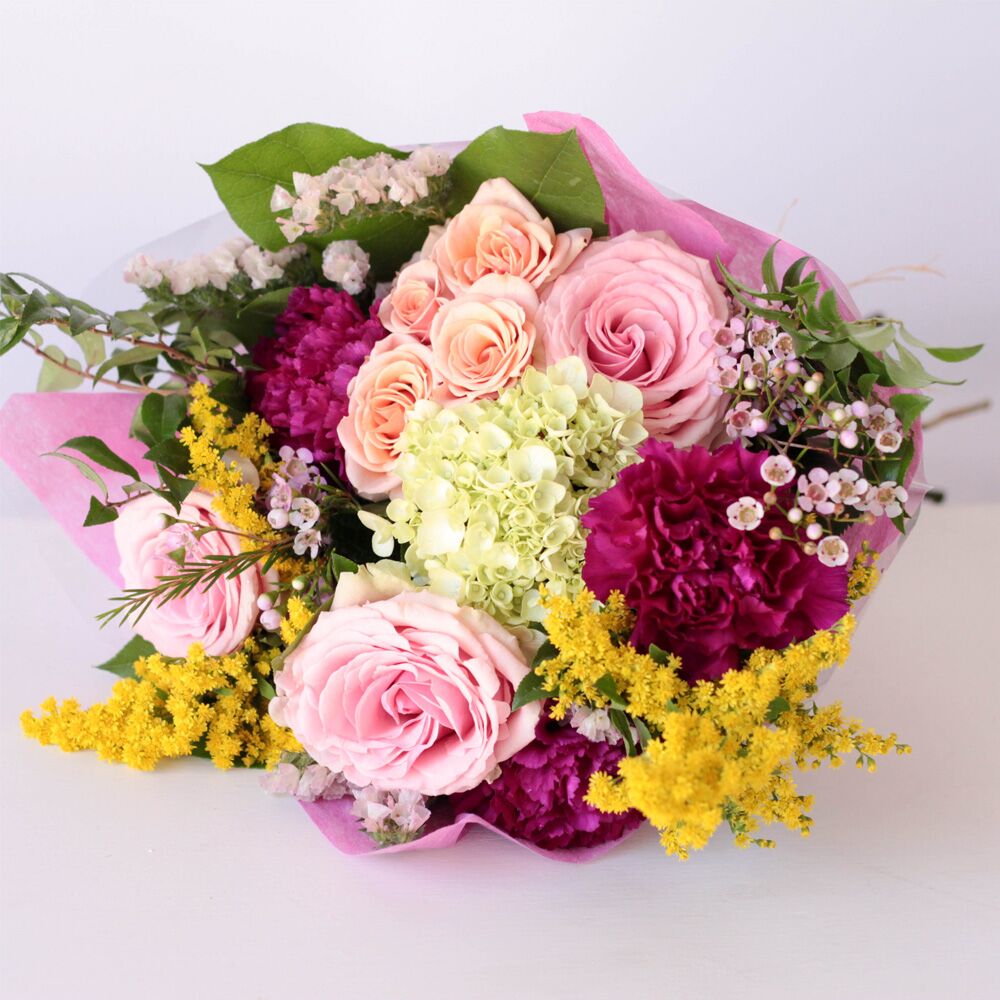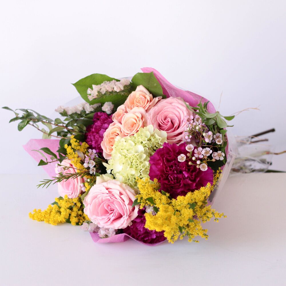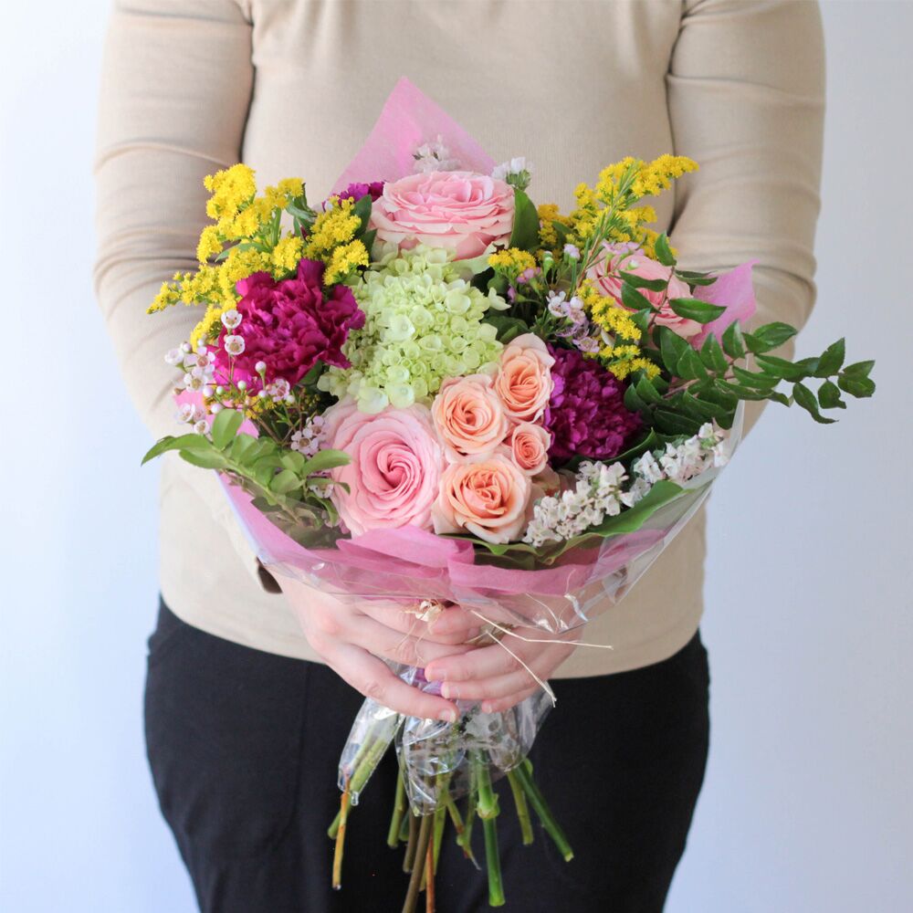 A lovely bunch of fresh-cut blooms in yellows and pinks.