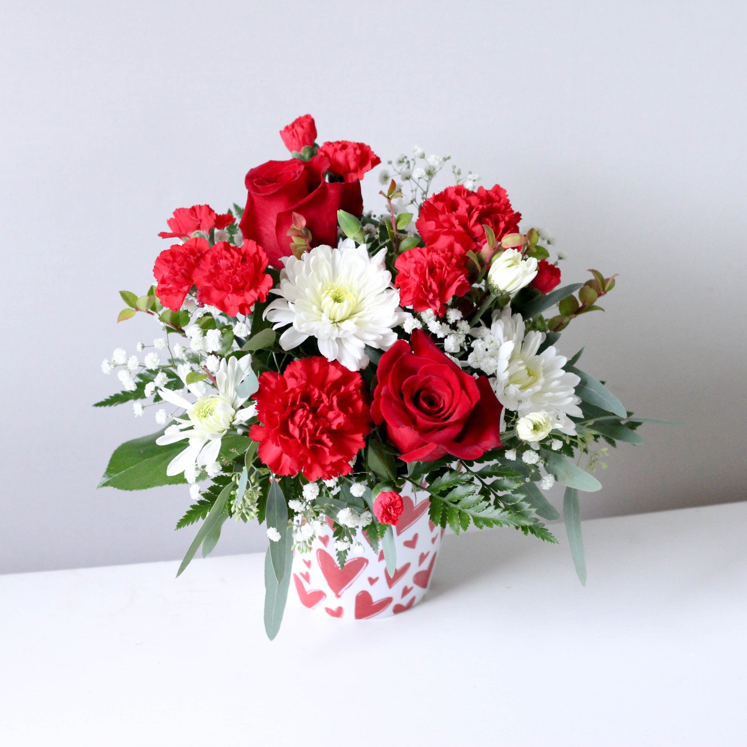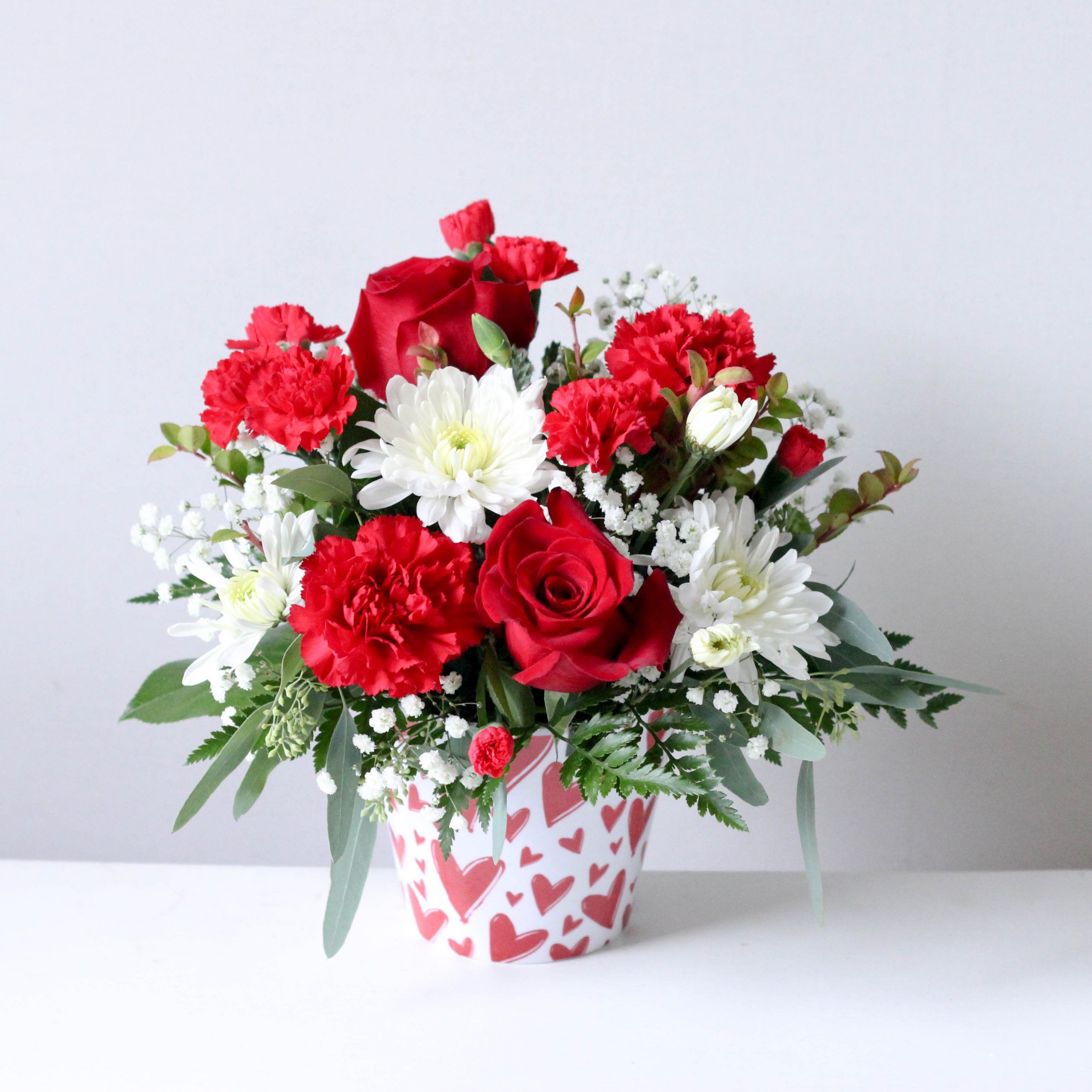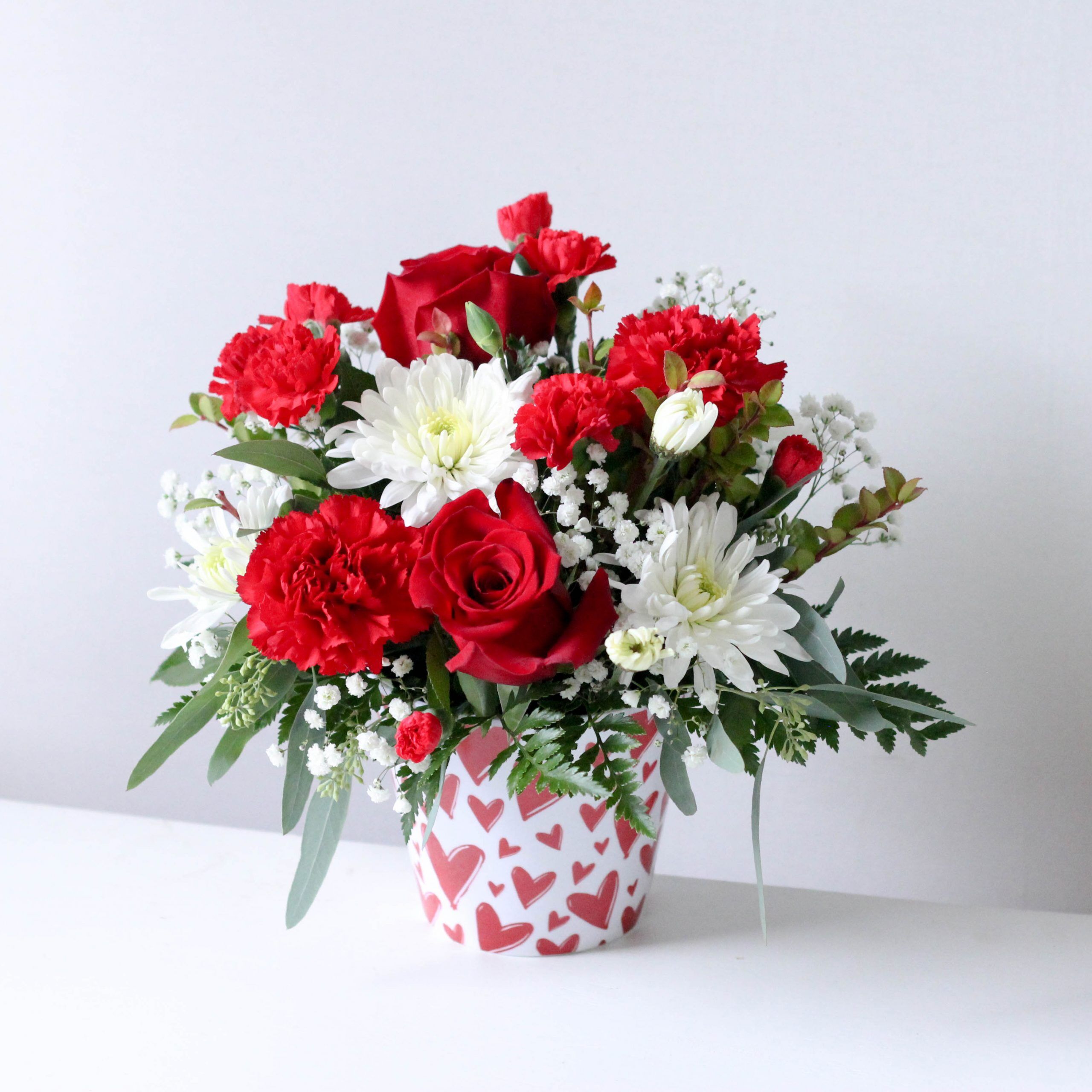 Red roses, dreamy spray roses, carnations and daisy poms are artfully arranged in a keep sake Heart Pattern pot adorned with assorted greens and fillers.