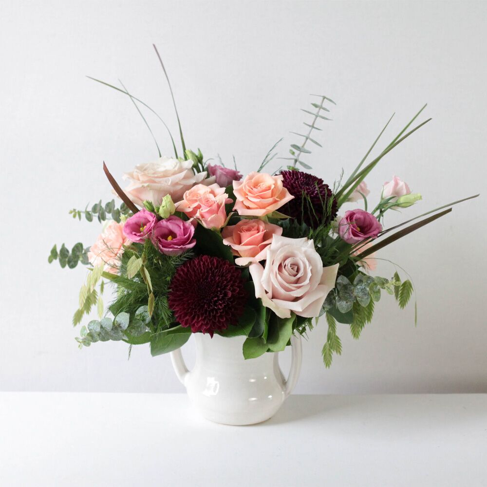 Delivered in a white ceramic, handled, Zara vase; Arrangement measures approx. 13″ W x 11″ H