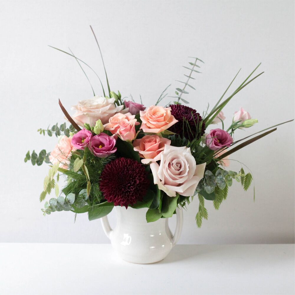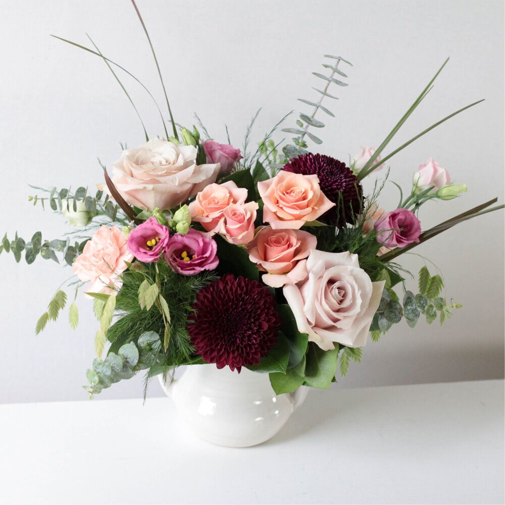 Deep purple mums are nestled in a bed of blush-toned roses, spray roses, carnations, and lisinathus.