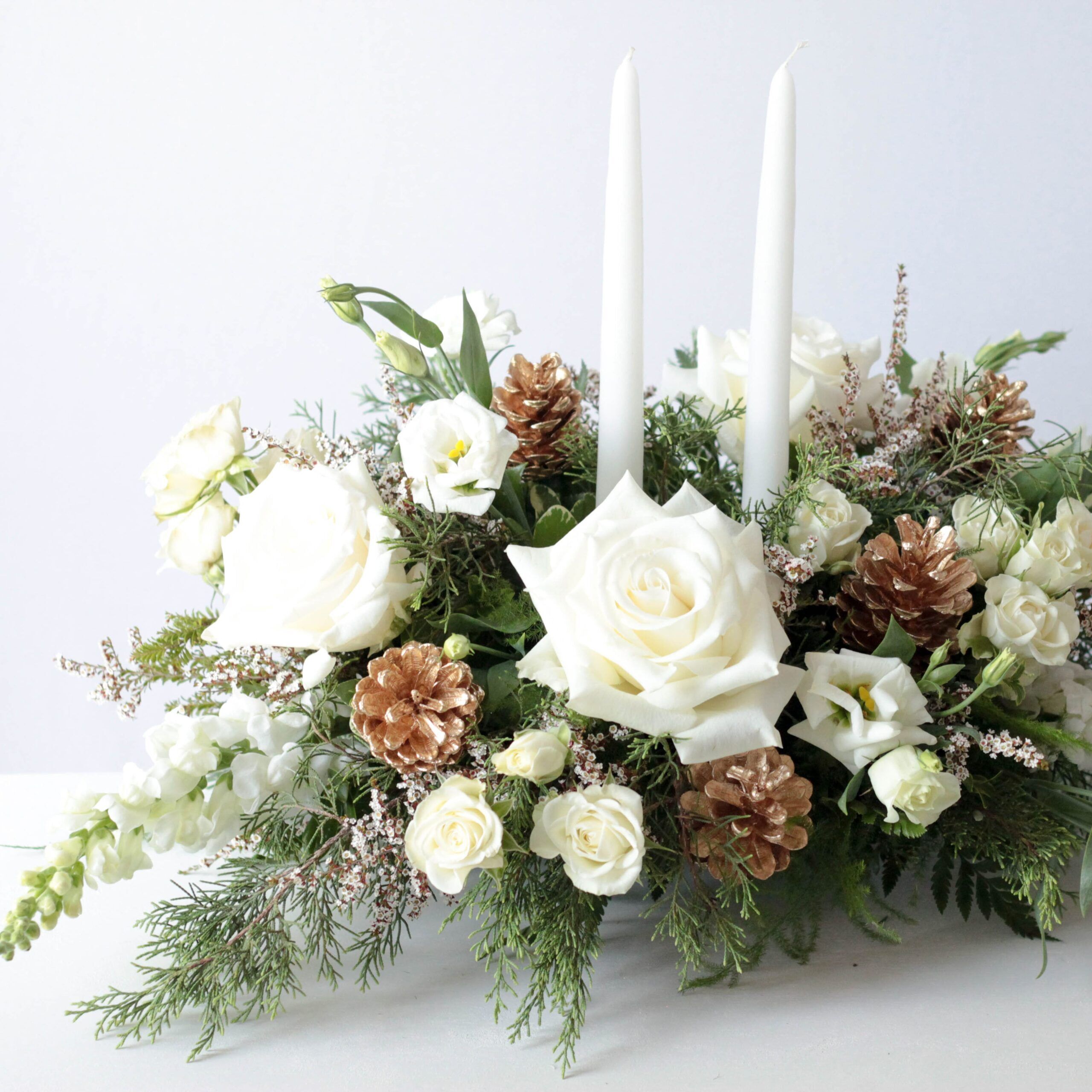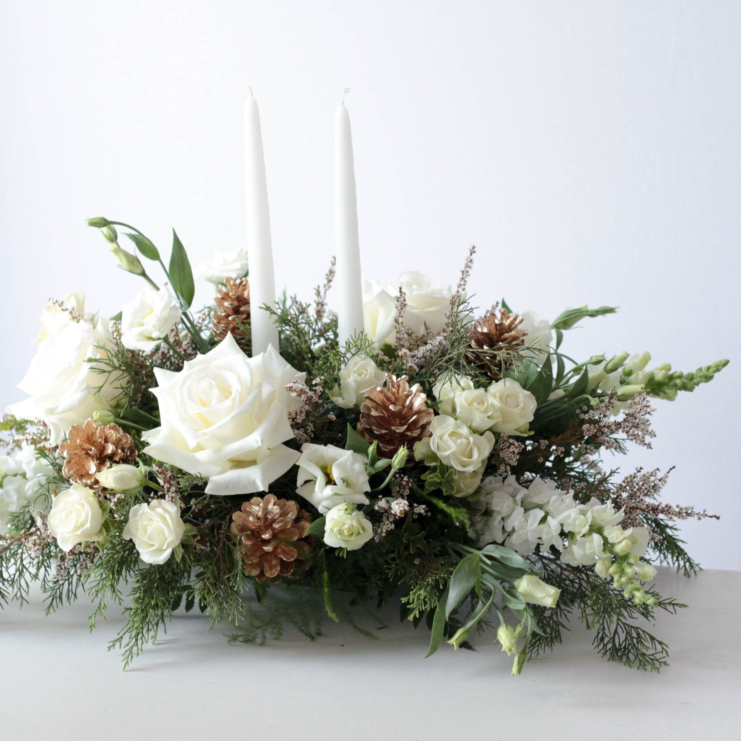 A lovely centerpiece consisting of seasonal greens, fresh floral blooms in cream and white, accented by white decorative berries and two white tapered candles.