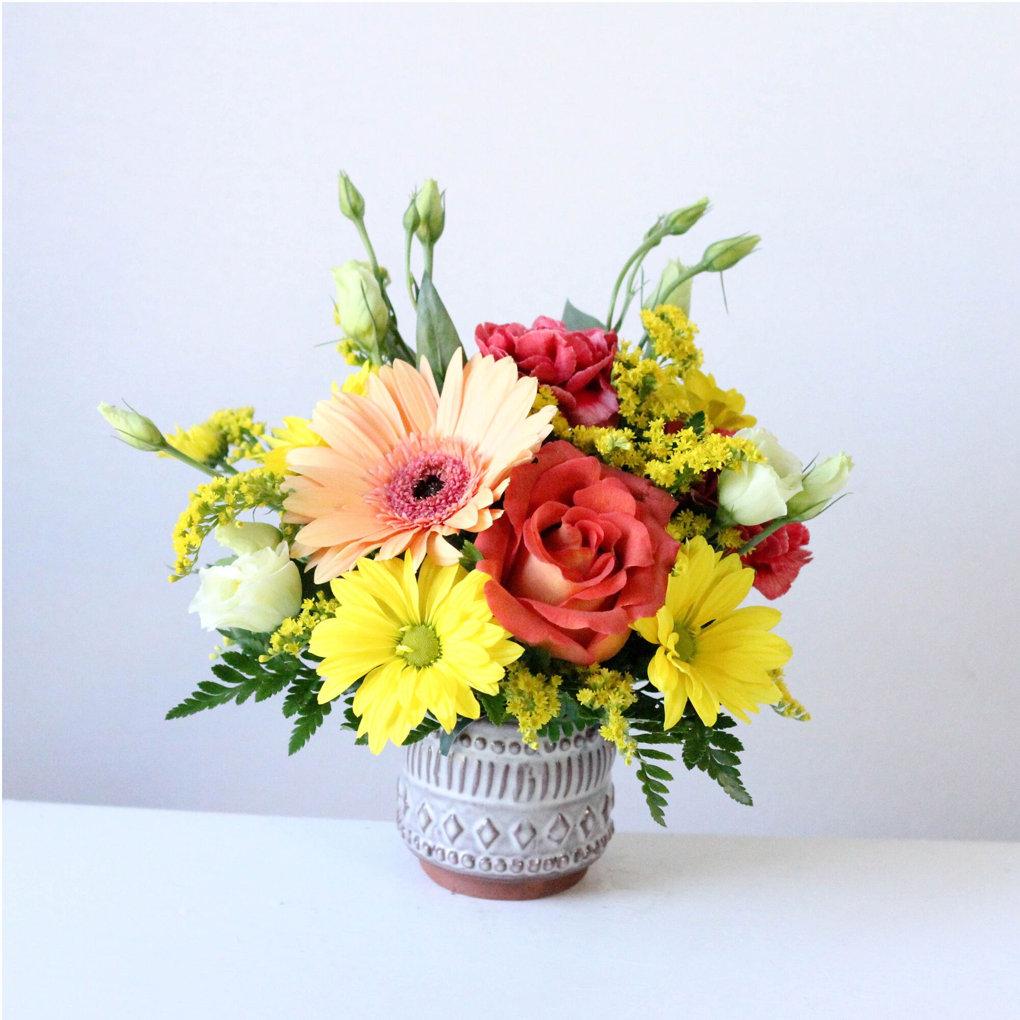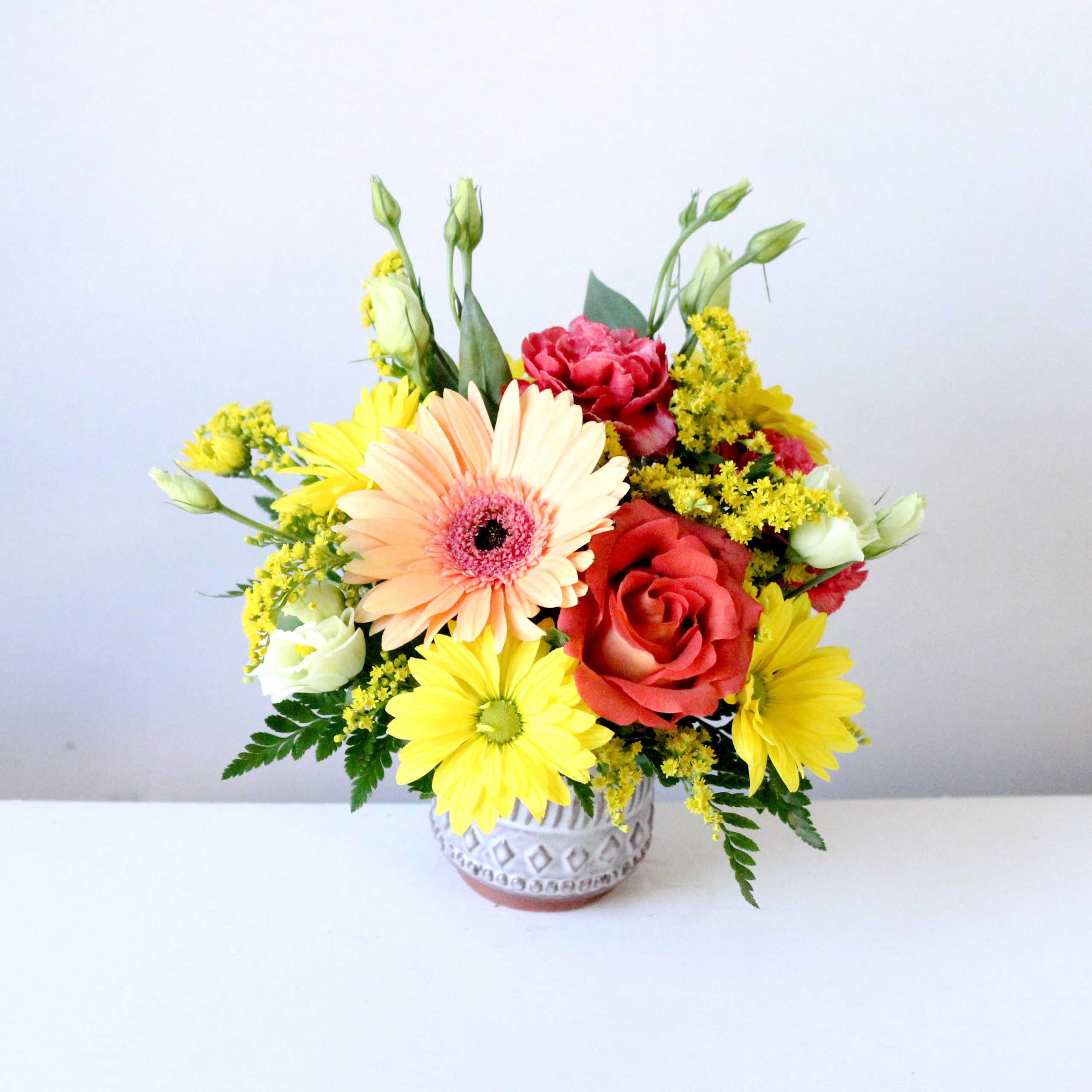 Delivered in a ceramic pot; Arrangement measures approx. 10″ W x 10″ H