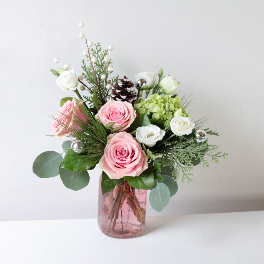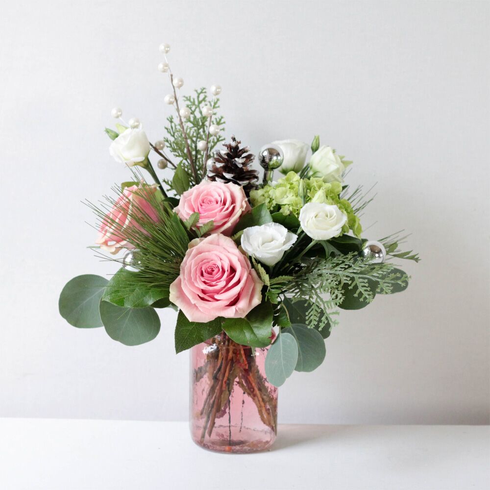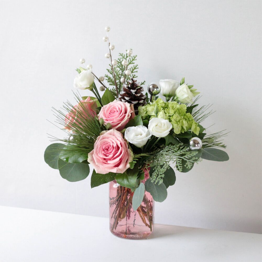 Fresh cut roses, mini green hydrangea, and lisianthus dance among seasonal greens, a pine cone, mini silver ornaments and berry stick.