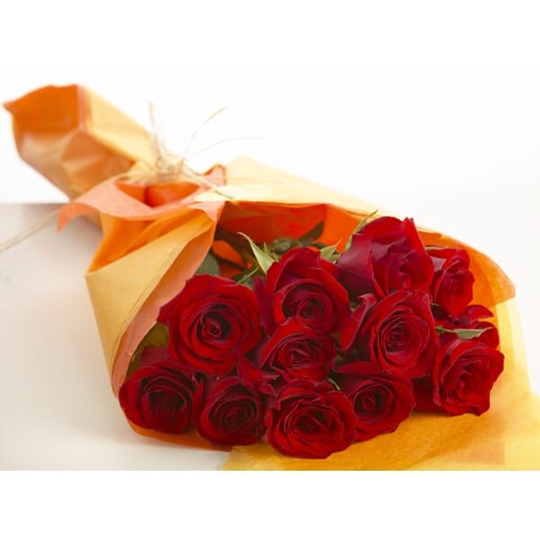 Twelve roses wrapped in paper for easy pick up and carryout.