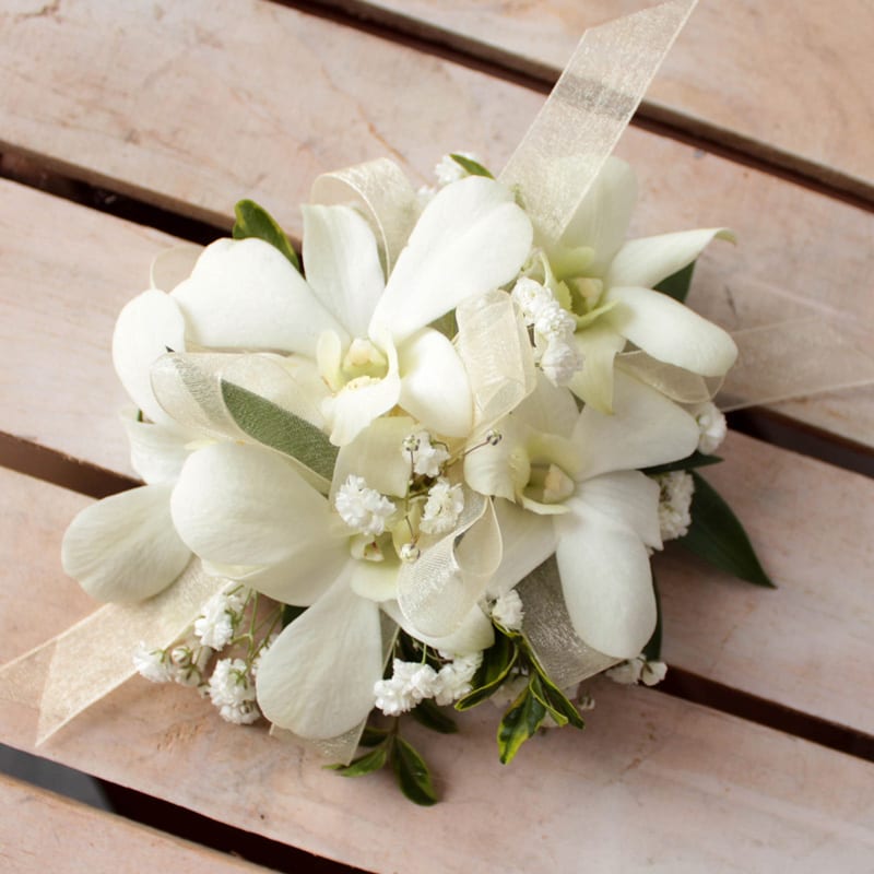 Five white dendrobium orchid blooms accented by greens, filler and a coordinating bow. Wrist attachment is included.