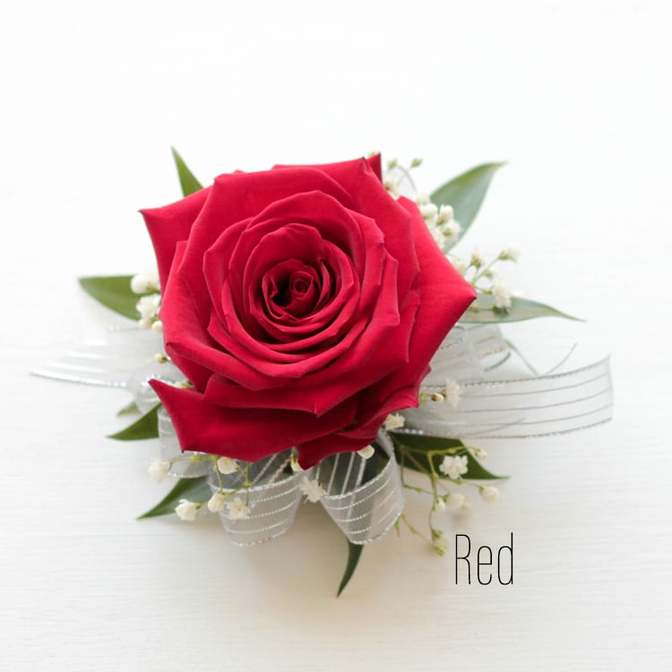 A single rose accented by greens, filler and a coordinating bow. Wrist attachment is included.